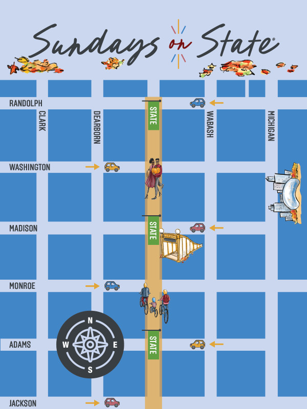 Sundays on State is on State Street between Jackson and Randolph. Enter N State St & E Randolph St, Chicago IL, 60601 into your GPS for directions. Whether taking public transportation, biking, driving, using cabs or ride hail, or walking, find how to get to the Loop here. Discounted Sundays on State parking can be booked in advance with Millennium Garages.