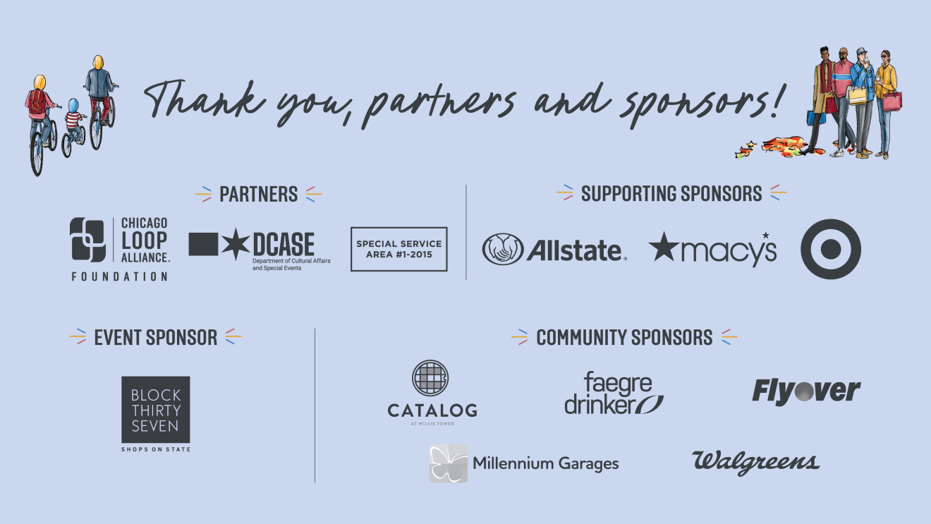 Sundays on State is a project of Chicago Loop Alliance in partnership with the Chicago Department of Cultural Affairs and Special Events, Chicago Loop Alliance Foundation and Special Service Area #1-2015. Supporting sponsors are Allstate Insurance Company, Macy’s and Target. The event sponsor is Block 37. Community sponsors are Catalog, Faegre Drinker, Flyover, Millennium Garages, and Walgreens.