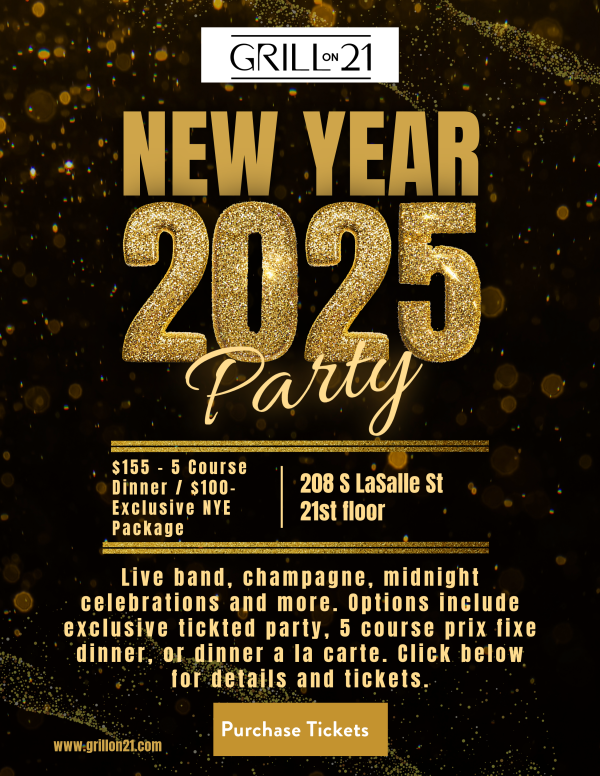 Ring in the New Year 21 stories up at Grill on 21 in the luxurious LaSalle Hotel Chicago. Get ready to dance the night away, sip on delicious cocktails, and enjoy an evening of fun with friends and loved ones. Tickets include: live band entertainment, top shelf drinks, premium hors d'oeuvres, champagne, party favors, midnight celebrations, and more. Don't miss out on this spectacular party - book your tickets here now!