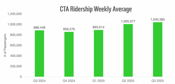Transit’s continued popularity among Chicago’s residents and visitors is reflected in Q3 ridership. CTA’s buses and trains carried a weekday average of over a million passengers, reaching 80 percent of pre-pandemic ridership and surpassing Q3 2024 levels by 17 percent—October 9 was CTA’s biggest ridership day since the pandemic, with 1.17 million rides. Metra saw 10.7 million passengers in Q3, a 14 percent increase from the same time in 2024.