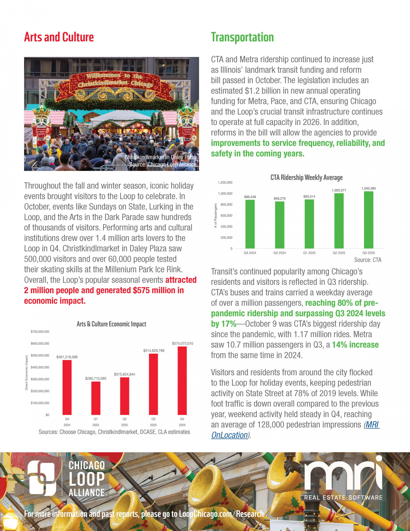 3 MIN READ -- Chicago Loop Alliance (CLA) released its quarter four 2025 State of the Loop report on downtown activity, using a variety of data sources, produced by CLA since July 2020. The report tracks pedestrian and transportation activity, investment, retail, arts and culture, and more. View the quarter four (Oct.-Dec. 2025) State of the Loop report here.