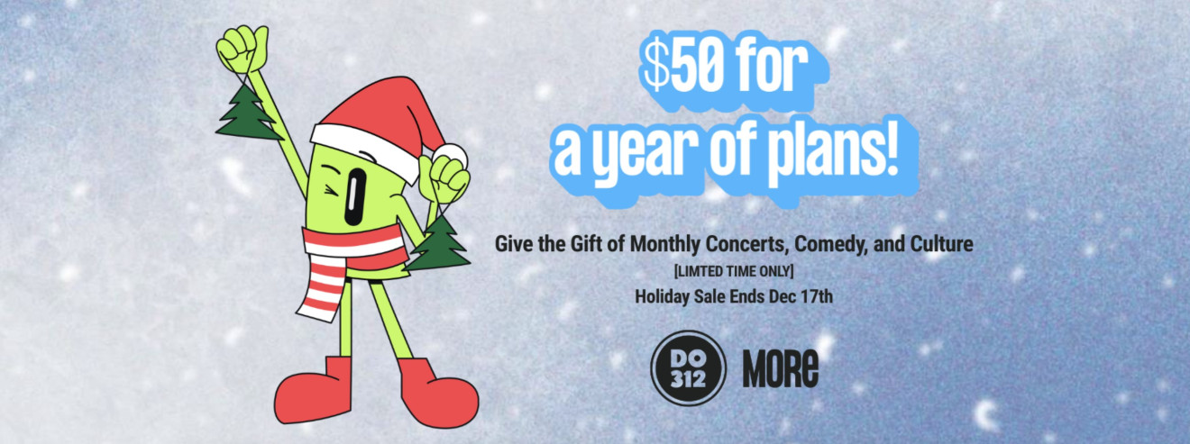 The lights are flickering, and your inbox is jingling. Time to make an easy decision: the Do312 MORE Holiday Sale. For $50, gift a year of free monthly tickets to concerts, comedy, and culture they’ll actually care about. No shipping, no wrapping, no guessing sizes – just instant access to better nights! It’s the gift for anyone who still believes the best holiday stories start outside the house. On sale Nov 17 – Dec 17.