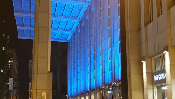 From July 6-13, prominent buildings in the Loop, including Willis Tower, lit up blue to celebrate “Everyone’s Neighborhood.” This light-up initiative was coordinated in partnership with the Building Owners and Managers Association of Chicago. Prominent institutions like the Chicago Theatre, Nederlander Theatre, Auditorium Theatre and Joffrey Ballet used their marquees to share the “Everyone’s Neighborhood” message. Digital and print graphics of the message were distributed to hundreds of other businesses and offices throughout the Loop.