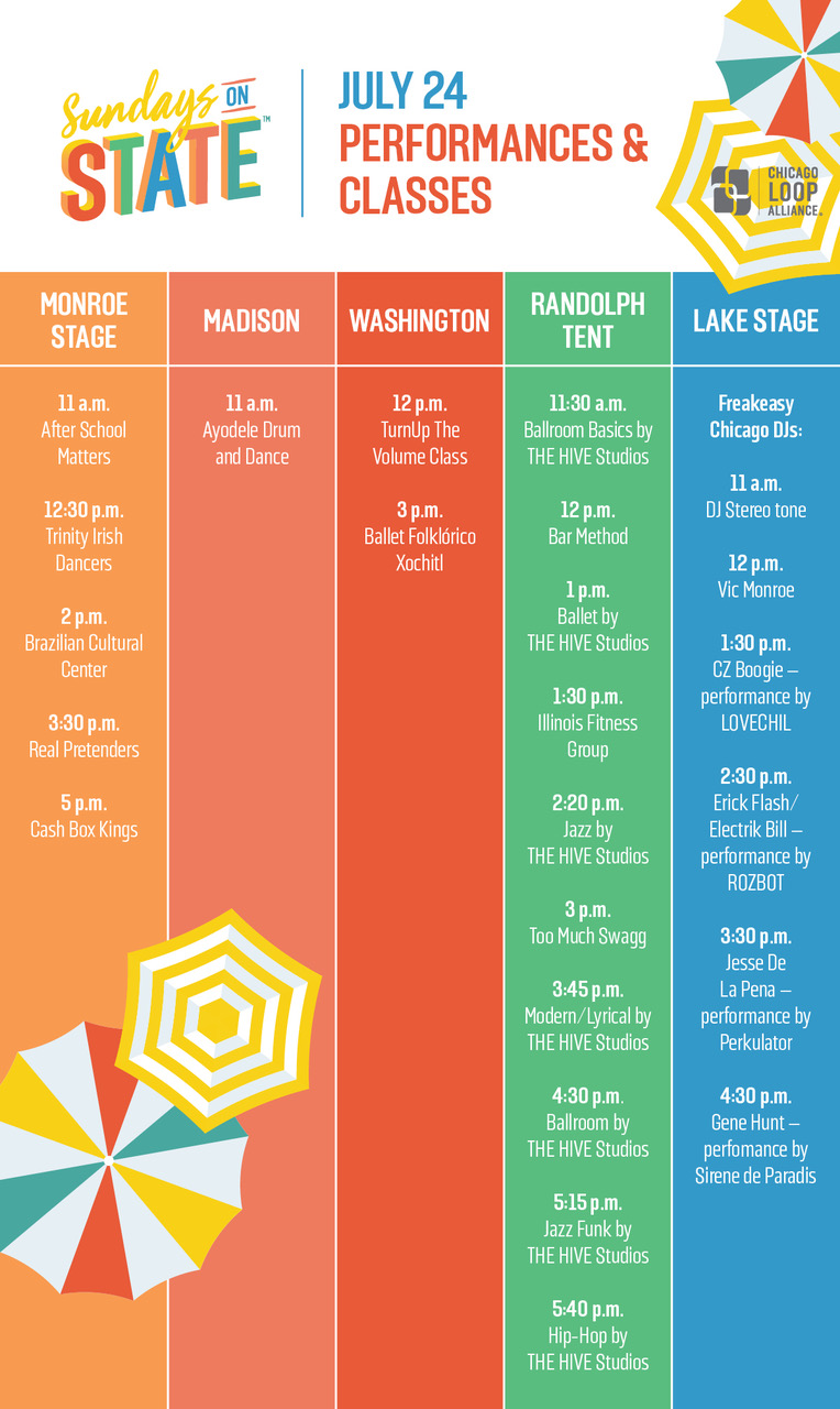 Sundays on State performances showcase a wide variety of Chicago’s world-class entertainment industry including blues, house, soul/funk, classical, reggaeton, ballet, musical theatre, and hip-hop. Performances, schedules, and activations are subject to change.