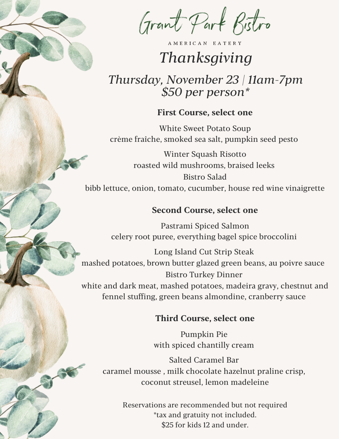 Let Beatrix Market do the cooking this Turkey Day with Thanksgiving Dinner To-Go options! Choose from the Complete Thanksgiving To-Go Dinner, including Turkey Breast with gravy, Cranberry Sauce, Parker House Rolls, and a choice of three sides for $205.00 plus tax, or finalize your own festive feast from a la carte options such as Butternut Squash Ravioli, Mashed Potatoes, House-Made Stuffing, Green Beans and more. Add on a Whole Traditional Pumpkin Pie or dessert to round out the spread. Orders must be placed by Friday, November 17th for carryout on Tuesday, November 21 and Wednesday, November 22. Beatrix Market has locations at 155 N. Wacker and 23 E. Jackson Blvd. Learn more here.