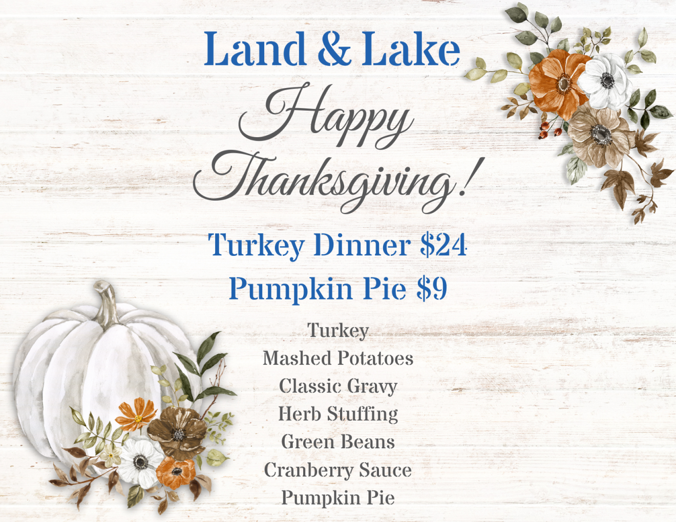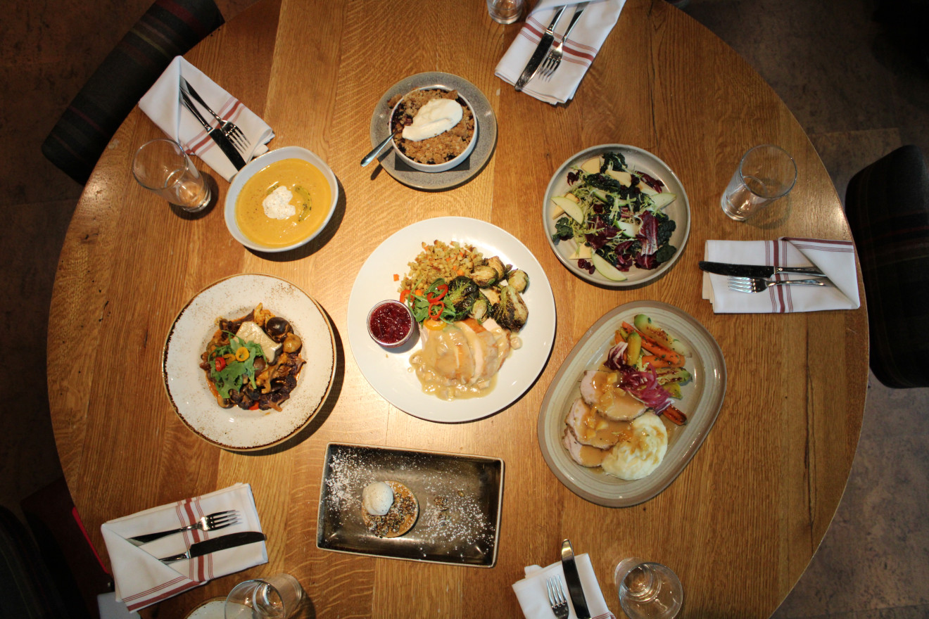 - Main Entrées: Heirloom Roasted Turkey Breast, Giblet Gravy, Ciabatta Stuffing , Roasted Brussels Sprouts and Cranberry Stuffing; Roast Berkshire Pork Loin, Dried Apricot-Thyme Jus, Garlic Mashed, Potatoes, Honey Glazed Carrots Cauliflower, Exotic Mushroom, Marble Potato Winter Curry