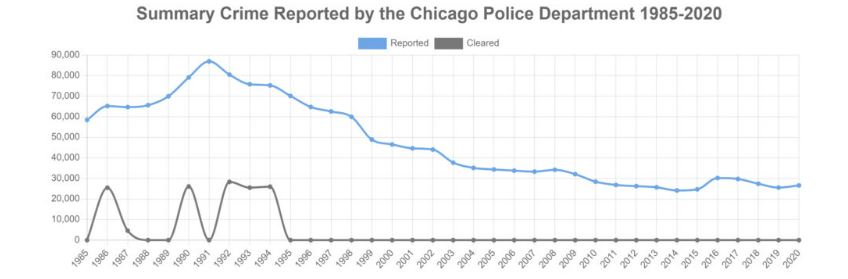 I won’t clutter this opinion piece with too many statistics, but I wanted to share this doozy from the FBI’s Crime Data Explorer that shows a pretty steady trend downward in Chicago’s crime since 1985: