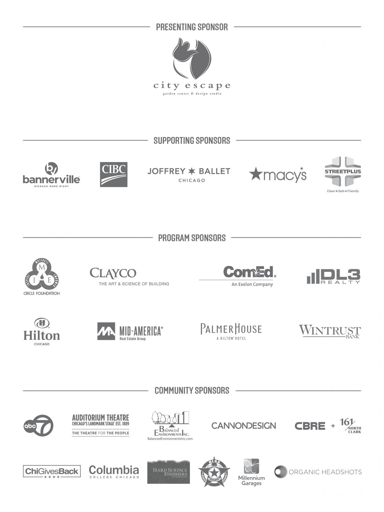 The Chicago Loop Alliance and Chicago Loop Alliance Foundation Annual Meeting was sponsored by Presenting Sponsor City Escape Design Studio and Garden Center; Supporting Sponsors: Bannerville, CIBC, The Joffrey Ballet, Macy’s, and Streetplus; Program Sponsors: CIRCLE Foundation, Clayco, ComEd, DL3 Realty L.P., Hilton of Chicago, Mid-America Group and Corporation, Palmer House, a Hilton Hotel, and Wintrust Bank.