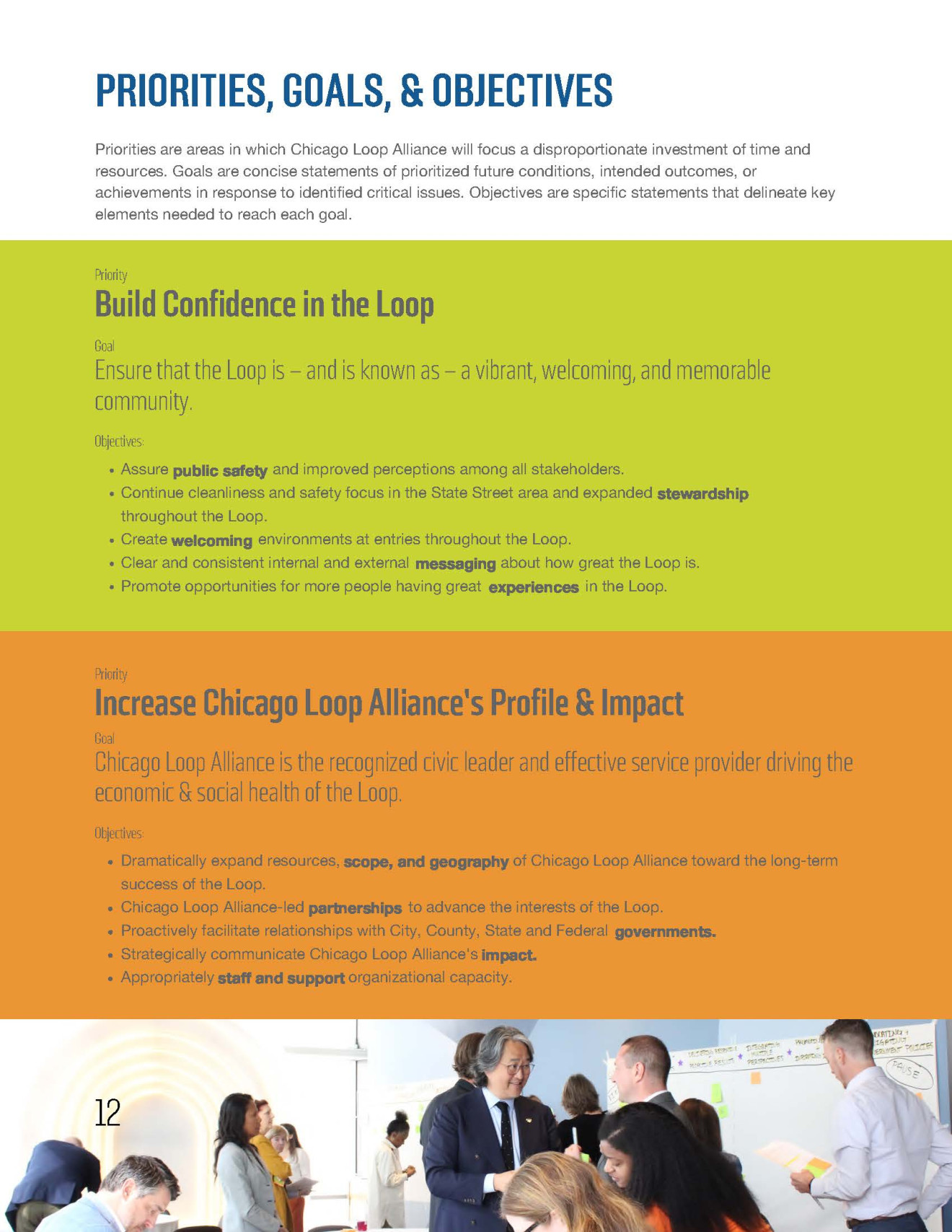 - A refined vision and mission for the organization, as well as four new strategic priority areas – Building Confidence in the Loop; Increasing Chicago Loop Alliance’s Profile and Impact; Ensuring Everyone’s Neighborhood; Creating a Complete Urban District