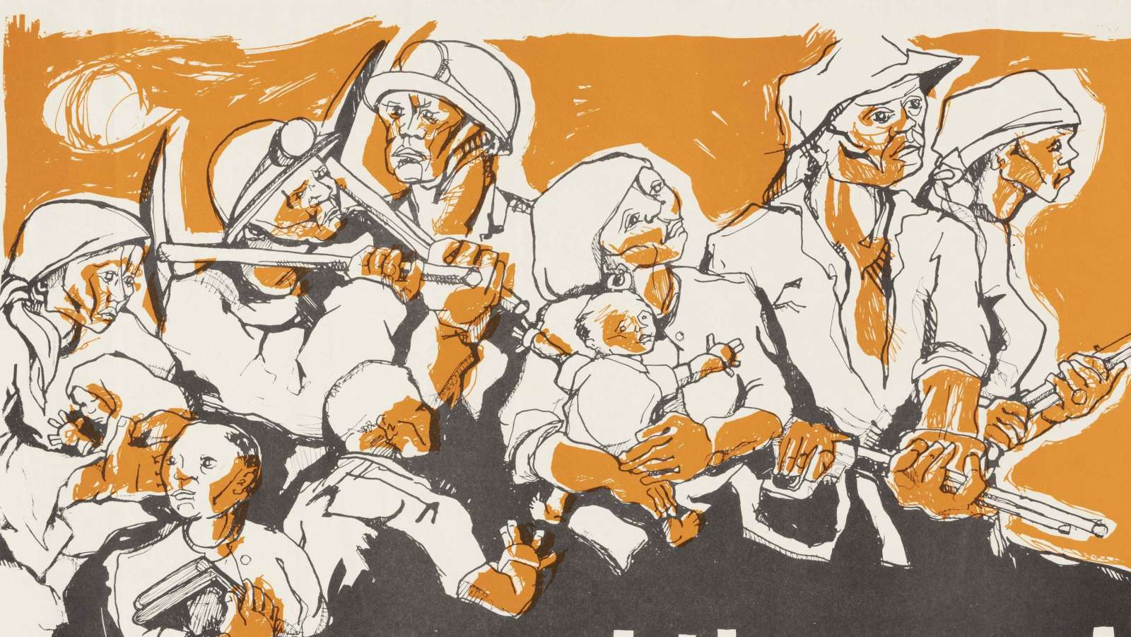 The Medu Art Ensemble formed in the late 1970s in opposition to South Africa’s apartheid policy of racial segregation and violent injustice. Through graphic design and poster production, members forcefully articulated a call for radical change, advocating for decolonization or majority (nonwhite) rule in South Africa and in the neighboring countries of Angola, Mozambique, Namibia, and Zimbabwe. Medu, meaning “roots” in the Sepedi language, evolved organically and operated underground, as its name suggests. Persecuted by the South African Defense Force, Medu members lived and worked in exile just across the South African border in Gaborone, Botswana. Defying a ban on their existence, the Medu collective at its height numbered as many as 50 South African and international artists, musicians, and writers. Learn More