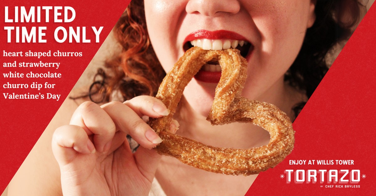 Fall in love with Tortazo’s new churro dip! Velvety white chocolate swirled with the sweet, fruity essence of strawberries—perfect for dipping, sharing, or keeping all to yourself. Celebrate love at first bite with a churro crafted by none other than Chicago’s Chef Rick Bayless. Check out the full menu here.