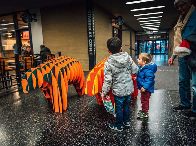In celebration of the winter solstice and as part of its continued work to draw attention to the Pedway, Chicago Loop Alliance’s “Massimals in the Loop” art installation was completed on Friday, December 20, under the Daley Center, Macy’s, and Thompson Center. The project will last through the winter.
