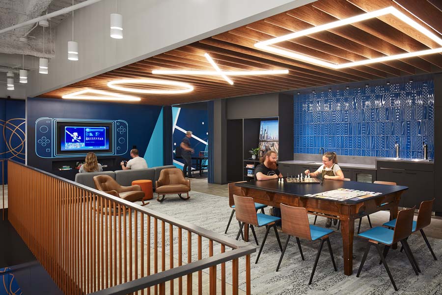 All work and no play? That’s not the case in iManage’s Loop office with good old-fashioned board games, video games and Ping-Pong situated nicely in their Game Room. The geometric lights on the slatted ceiling add a playful touch.