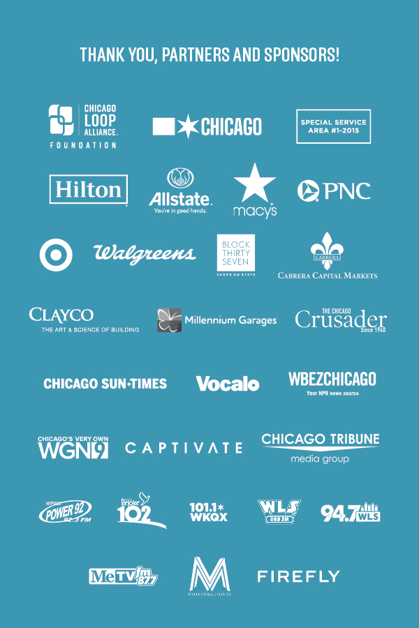 Sundays on State is a project of Chicago Loop Alliance in partnership with Chicago Loop Alliance Foundation, City of Chicago, and SSA#1-2015. Event sponsors are Hilton, Allstate, Macy’s, PNC, Target and Walgreens. Community sponsors are Block 37, Cabrera Capital, Clayco and Millennium Garages. Captivate, The Chicago Crusader, Chicago Sun-Times, Chicago Tribune, Firefly, Me-TV FM, Power 92.3, Rejoice 102.3, Soul 106.3, Vocalo, WBEZ, WGN, WLS-AM 890, 94.7 WLS-FM, 101WKQX and WVON are media sponsors. Allison Gerlach is the project manager, and Star Events is the event production company for Sundays on State.