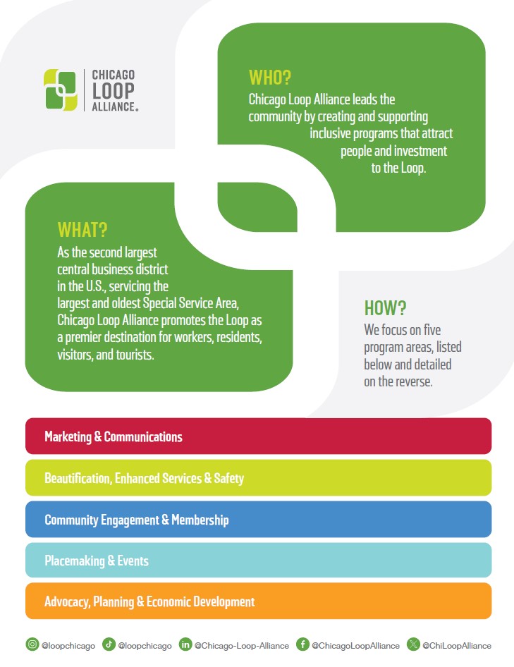 Chicago Loop Alliance leads the community by creating and supporting inclusive programs that attract people and investment to the Loop. CLA is a member-based business organization that represents Chicago’s most dynamic mixed-use district — the Loop — and advocates for the rapidly growing central business district. With hundreds of member businesses representing the Loop’s business, civic and cultural institutions, Chicago Loop Alliance is the only organization whose primary role is to promote businesses and lead revitalization efforts specific to the Loop.